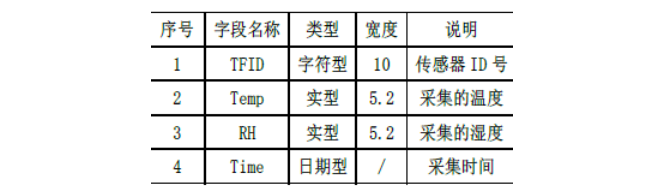 对于采集的数据,在后端数据存储处理中采取数据库存储方式,通过对数据的分析,得到主要数据表(TF_Info)结构如表1所示。TF_Info数据表存储采集到的温度和湿度数据,由4个字段组成,TFID 表示所采集的传感器ID号,Temp表示采集的温度数据,RH表示采集的湿度数据,Time表示采集温湿度数据的采集时间。